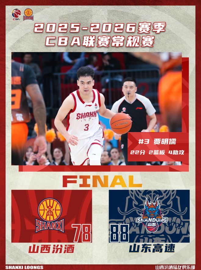 北京时间2025年12月30日19:35,2025-2026赛季CBA联赛第八轮继续进行,山西汾酒赴客场挑战山东高速。两队历史上共交手40次,山西汾酒14胜26负,上赛季常规赛两队交手2次,山西汾酒2胜0负。本场比赛,山西队状态低迷,特别是上半场,进攻犹豫、防守松懈,篮板球保护不佳;中场调整后虽有所改善,但由于此前落后过多,最终无力翻盘,全场比赛结束,山西汾酒78:88不敌山东高速。