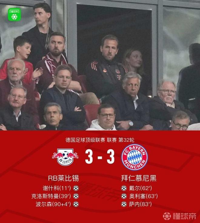 德甲联赛第32轮,RB莱比锡主场对阵拜仁慕尼黑。上半场,谢什科建功,克洛斯特曼破门帮助莱比锡建立两球领先优势;下半场,比赛信号一度中断,戴尔头球破门扳回一城,奥利塞迅速扳平比分,萨内抽射破门反超比分,但比赛最后时刻波尔森上演绝平。最终,拜仁在客场苦战中,3-3战平莱比锡,凯恩的首冠因而继续推迟。